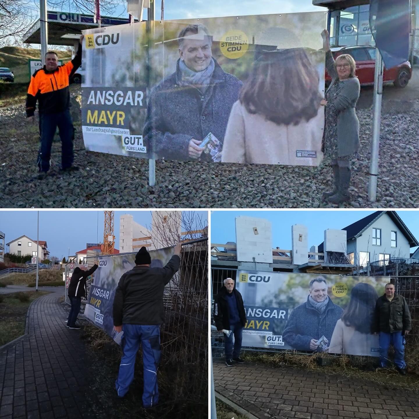 So heiße Phase des Wahlkampfs hat begonnen. Gestern haben Mitglieder des Ortsverbands die ersten beiden großen Banner für @ansgar.mayr aufgehängt. Habt ihr sie schon entdeckt? #cdubw #cdukarlsruheland #cduoberderdingen #landtagswahl2026bw